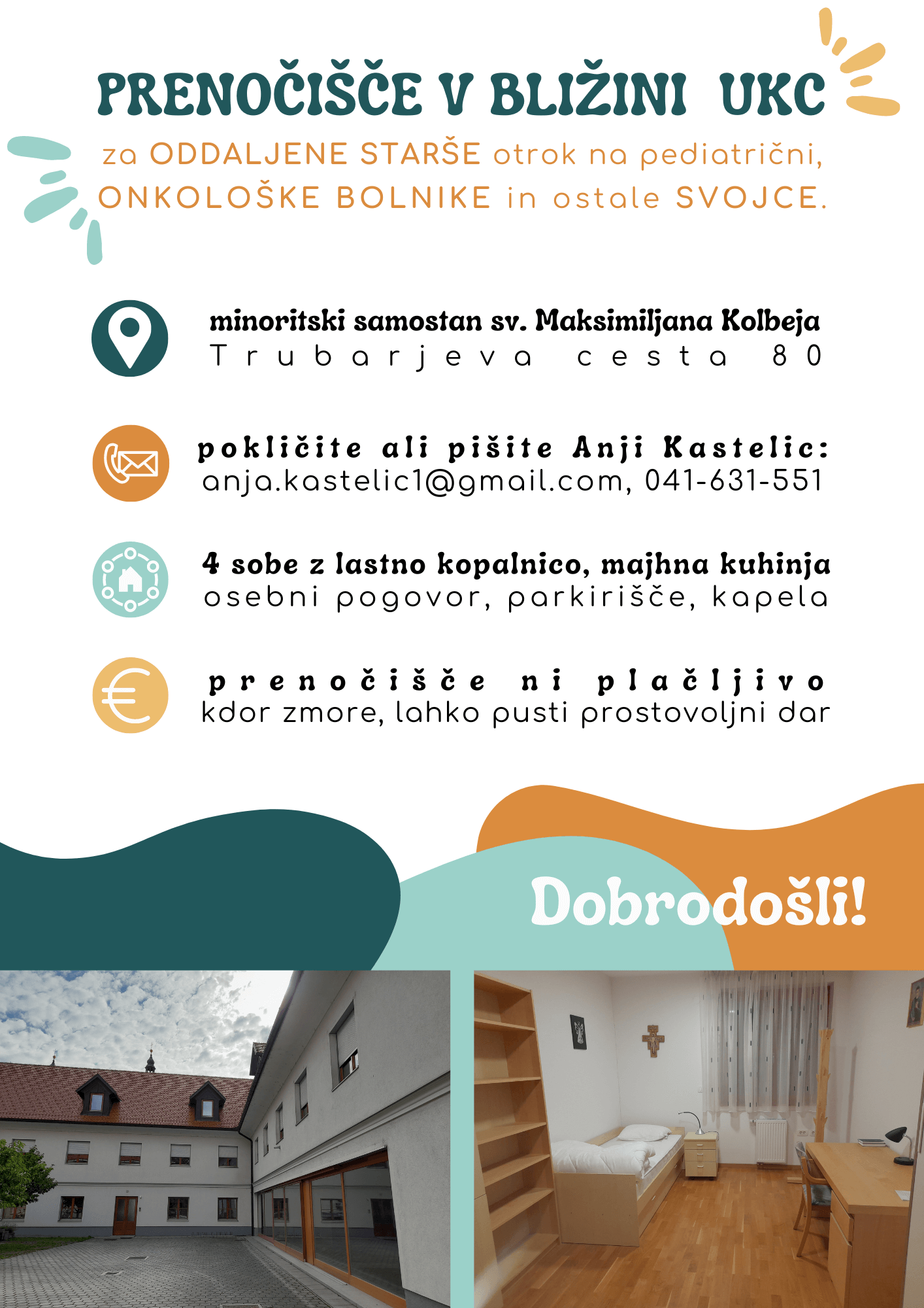 4 sobe z lastno kopalnico, majhna kuhinja, parkirišče, kapela, osebni pogovor. Prenočišče ni plačljivo. Kdor zmore, lahko pusti prostovoljni dar.